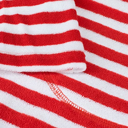 • A red and white stripy tee made of soft towel material, showcasing a cute print of Minnie's face