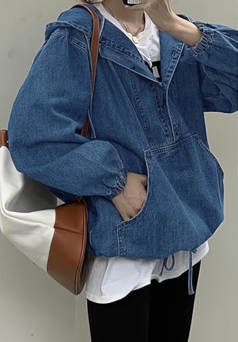 chouyatou Women Hooded 1/2 Button Down Pullover Denim Jacket Hoodie Boyfriend Casual Jean Sweatshirt Top 1
