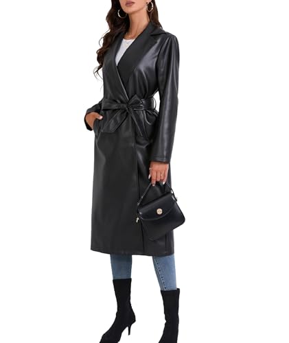 xxxiticat Women's Leather Trench Coat Long Sleeve Open Front Motorcycle Lapel Belted Tie Long Black Faux Leather Jacket 1