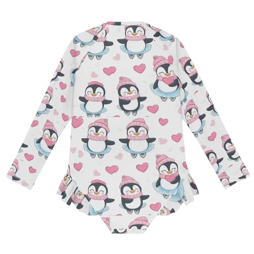 Cute Penguin and Pink Love Heart Girls Long Sleeve Swimsuit Rash Guard One Piece Bathing Suits Zipper 3-12T 3