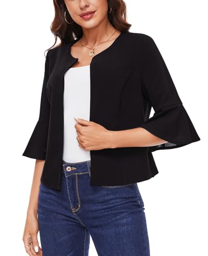 • 【Flared Sleeve】:The womens cropped jacket comes with open front, flared sleeve and ruffle hem design, shows basic timeless classic and trendy style. 3/4 flared sleeves add a feminine and romantic touch to the blazer, tailored to fit many body frames, providing a flattering look and a touch of elegance.