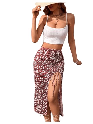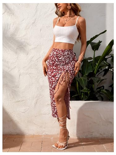 • Spaghetti Strap, Sleeveless, Open Back, Crop Cami Top, Split Thigh, Floral Print, Midi Bodycon Skirt, Casual Skirt Sets