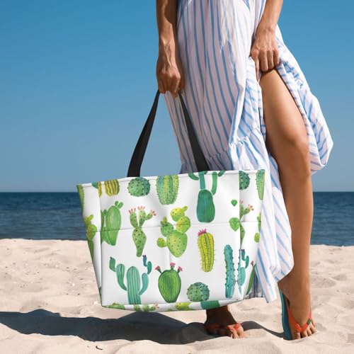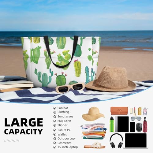 HOT ! Cactus Print Large Capacity Beach Travel Bag For Family, Beach Tote Bag For Women With Zipper Pockets